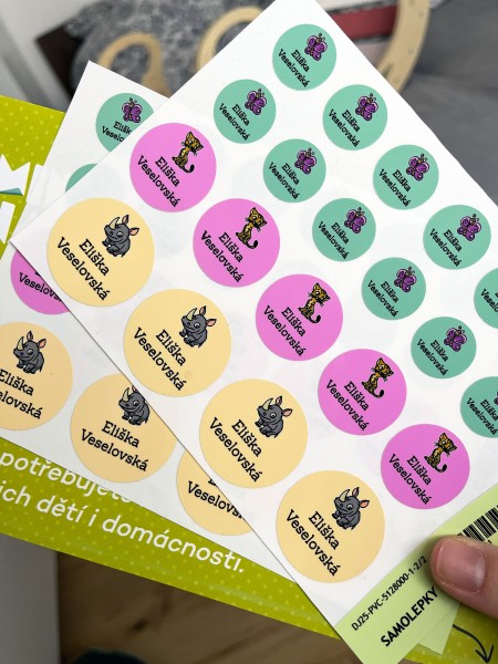 Samolepky dobře drží nejen na pevných površích, ale také na batohu, penálu, lahvi nebo textilních doplňcích. Ideální řešení pro označování věcí, personalizaci a každodenní použití.